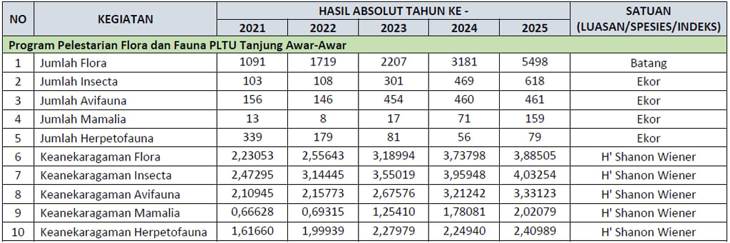 Tabel Absolut Program Pelestarian Flora dan Fauna PLTU Tanjung Awar-Awar Tahun 2021 - 2025